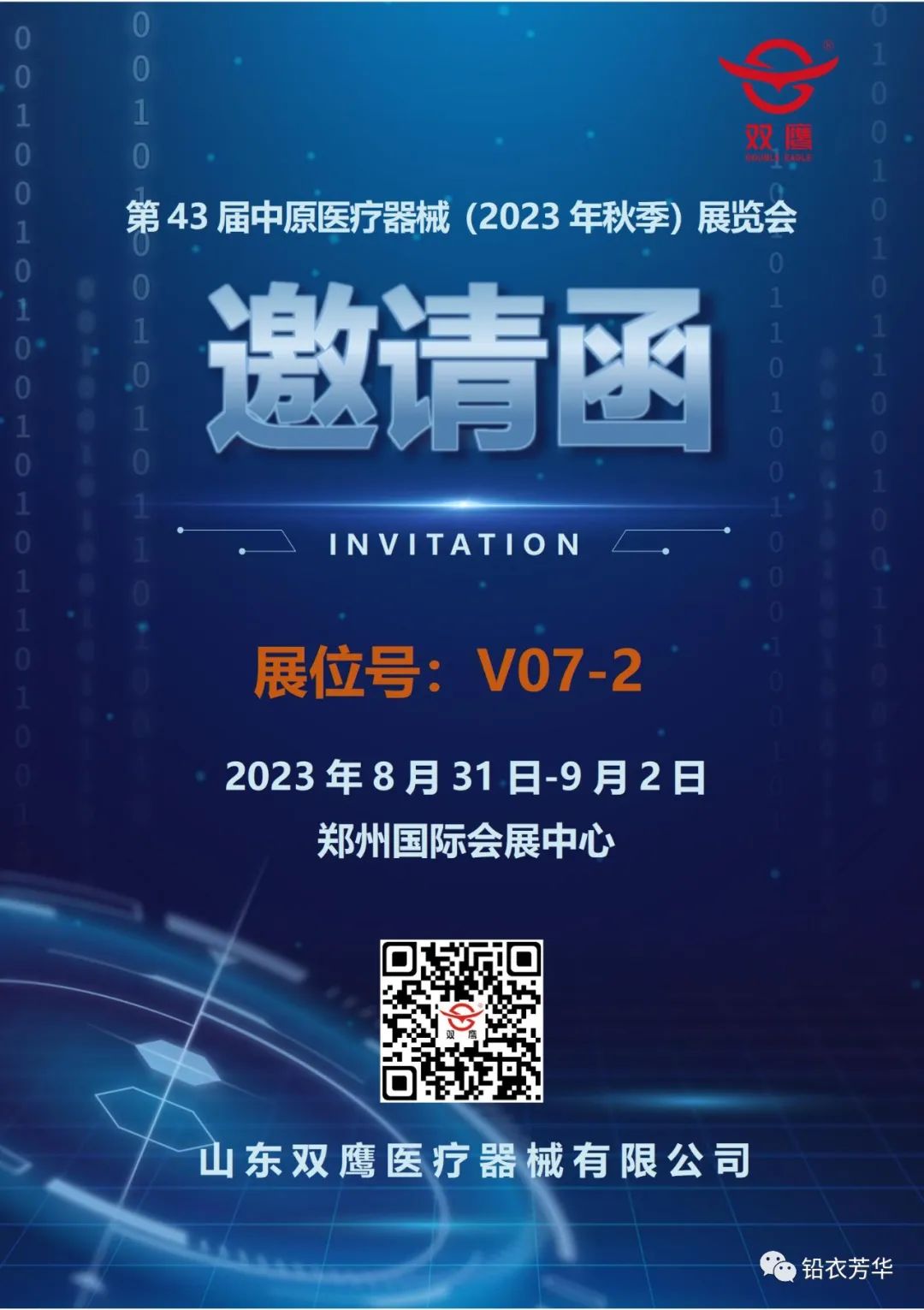 2023年8月31日-9月2日,第43屆中原醫療器械(2023年秋季)展覽會在鄭州國際會展中心隆重舉行,屆時,雙鷹醫療在V07-2號展位恭候您的光臨!